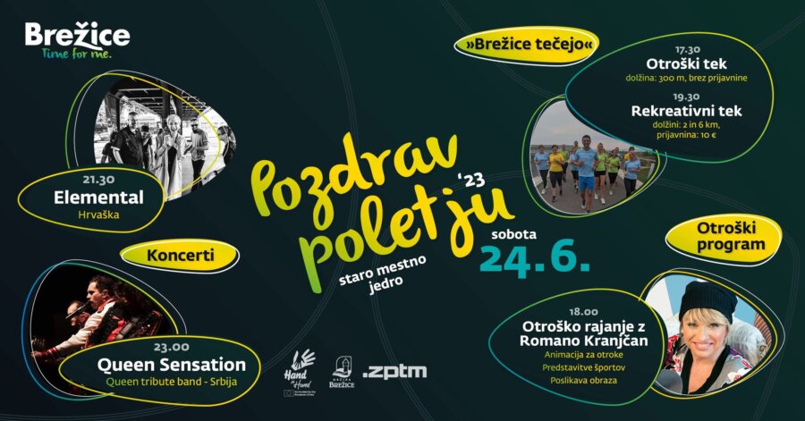 Projekt »Brežice tečejo« bo navdušencem teka ponudil dve rekreativni trasi, na svoj račun pa bodo z otroškim tekom prišli tudi najmlajši ter ljubitelji drugih športov, saj bo na ulici istočasno potekala predstavitev športov za mlade v sklopu projekta Z roko v roki. Družabno popoldne se bo nadaljevalo tudi v večerni program, ko bo na oder prišla Romana Kranjčan, ki bo poskrbela za otroško rajanje, večer pa bo prava poslastica za vse ljubitelje dobre glasbe; na brežiški mestni oder namreč prihaja hrvaška zasedba Elemental in eden izmed najboljših Queen tribute bandov Queen Sensation.