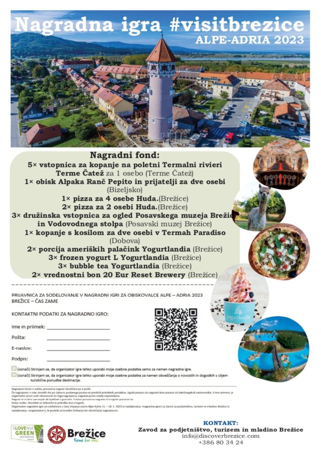 Najdete nas v Marmorni dvorani B, kjer lahko sodelujete v 𝐧𝐚𝐠𝐫𝐚𝐝𝐧𝐢 𝐢𝐠𝐫𝐢, ki smo jo pripravili skupaj s partnerji ponudniki: Terme Čatež, Alpaka ranč Pepito in prijatelji, Huda., Posavski muzej Brežice in Vodovodni stolp, Terme Paradiso, Yogurtlandia, Reset Brewery.