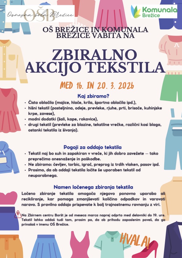 Osnovna šola Brežice in Komunala Brežice vas vabita, da prevetrite svoje omare in sodelujete v dobrodelno-ekološki akciji. Namesto da tekstil konča med mešanimi odpadki, mu podarite novo priložnost za ponovno uporabo ali recikliranje.