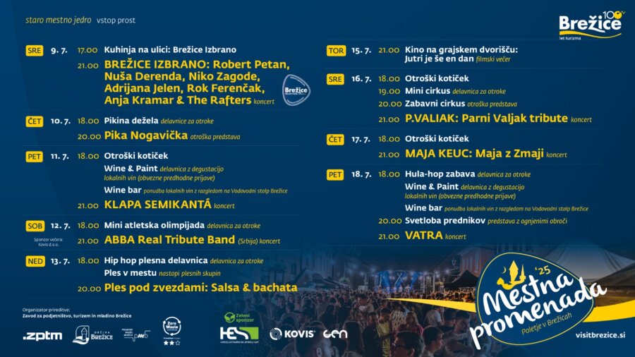 Torek na Mestni promenadi tradicionalno prinaša filmski večer (Kino pod zvezdami) v Posavskem muzeju Brežice, sledi sredina cirkuška predstava Bratov Malek in koncert Parni Valjak tribute banda – P. Valiak. Četrtkov večer bo čustven, uživali bomo v glasbeno dovršenem nastopu Maje Keuc, ki bo na odru združila energijo z lokalnim Otroškim pevskim zborom Lučke iz Kapel.