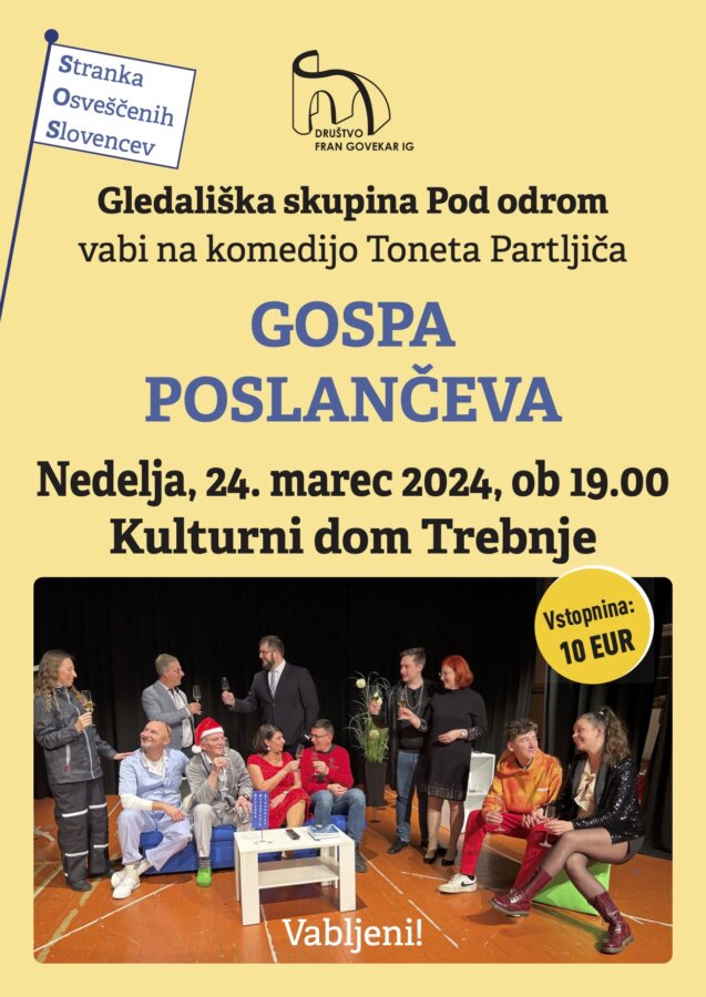 Vabimo vas na komedijo Toneta Partljiča, GOSPA POSLANČEVA v izvedbi gledališke skupine “Pod odrom”, ki bo v nedeljo, 24. marca 2024, ob 19. uri v Kulturnem domu Trebnje.