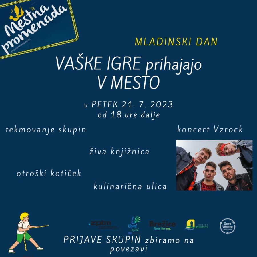 Mladinski center Brežice v sklopu dogodka Mestne promenade organizira v petek, 21. 7. 2023 vaške igre za mlade, ki se bodo zaključile s koncertom narodno-zabavne skupine Vzrock.